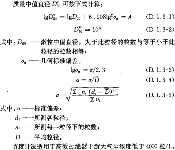D.1.3 光度計(jì)法可用于最大穿透率大于等于0.001%的過濾器檢漏,應(yīng)采用多分散的檢漏氣溶膠,其質(zhì)量中值直徑為0.5μm~0.7μm,幾何標(biāo)準(zhǔn)偏差約為1.7。