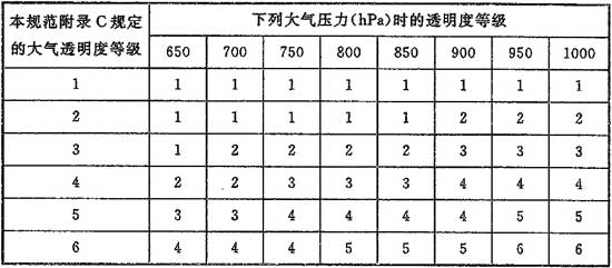4.3.4 采用本規(guī)范附錄C和附錄D時,當?shù)氐拇髿馔该鞫鹊燃墤鶕?jù)本規(guī)范附錄E及夏季大氣壓力按表4.3.4確定。